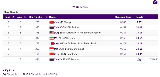 در شروع رقابت ۱۰۰ متر دونده تایلندی به دلیل اینکه زودتر از شلیک تپانچه داور دوید، کارت قرمز گرفت و حذف شد.
